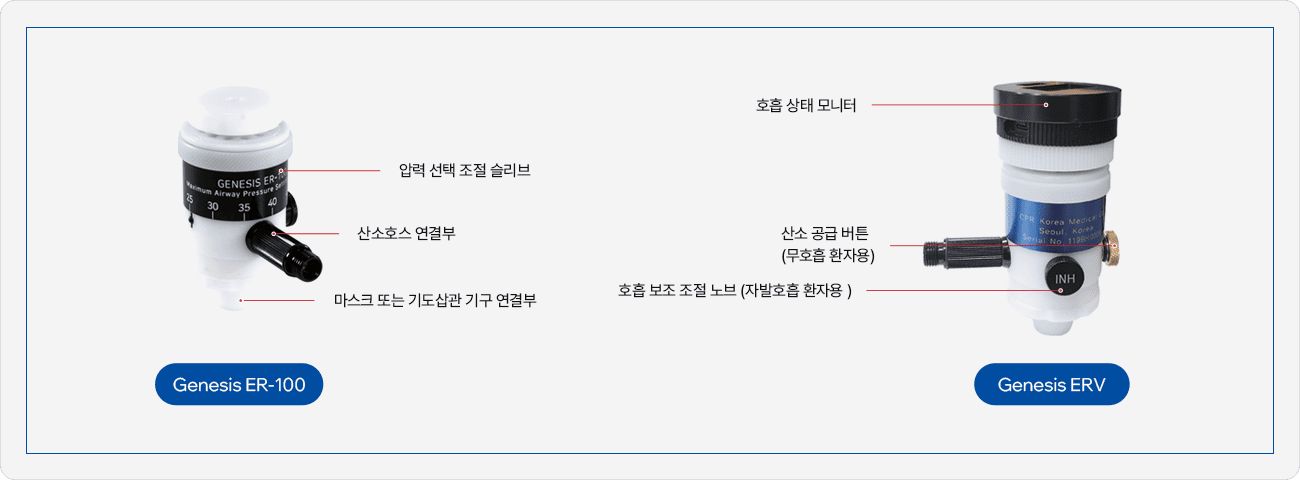 GENESIS는 환자의 상태에 따라 감응하는 방식으로 작동하는 의료용 인공호흡기로서, 호흡 정지 환자에게 압축 산소를 안전하고 적절하게 공급하여 호흡을 소생시키는 장비로 개발되었습니다. 환자의 폐 상태(폐의 크기 및 유연성)를 감지하여, 분당 호흡수(BPM)와 1회 호흡량(1회 공급 산소량)을 자동으로 조절·동작합니다.